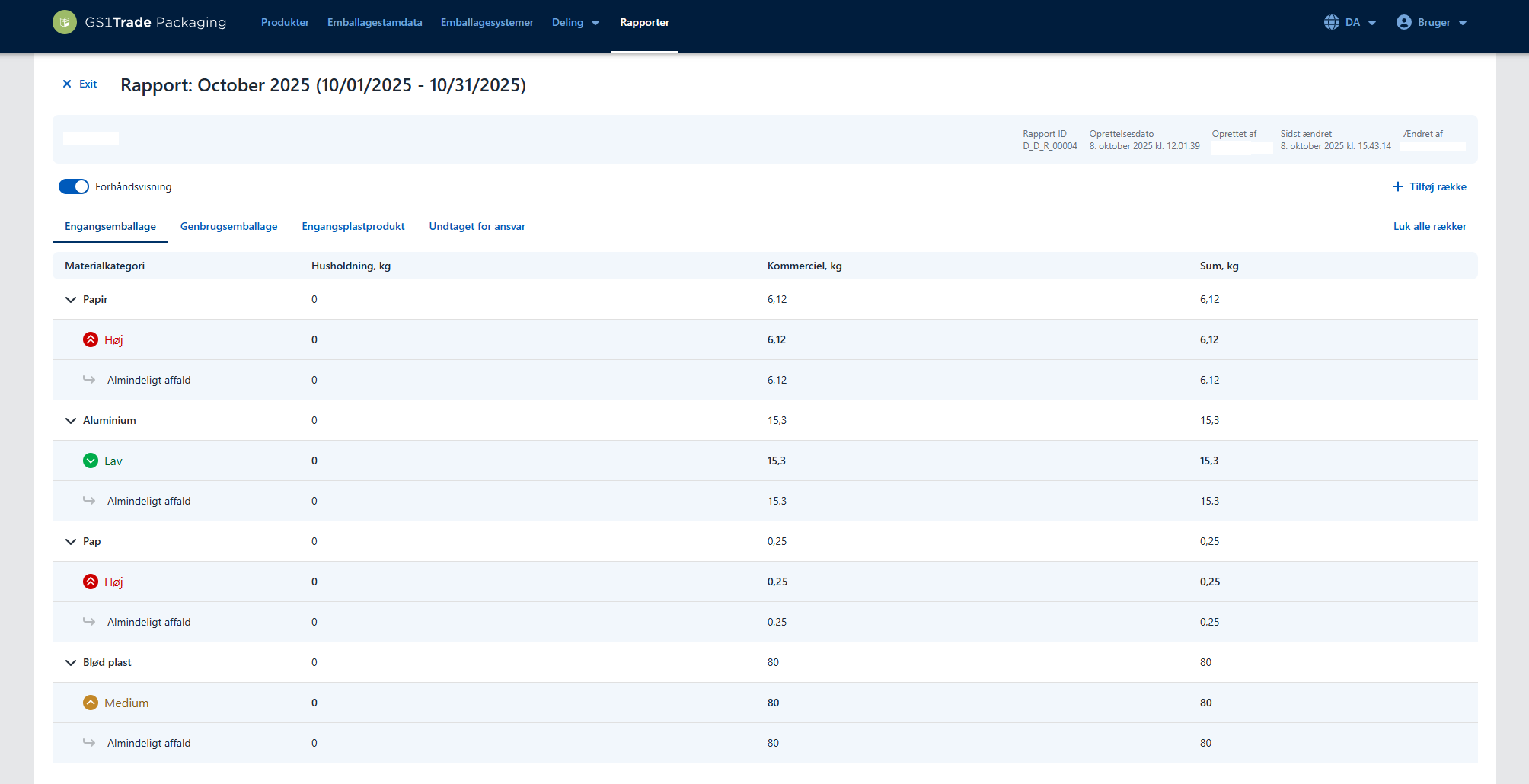 The other tabs show packaging volumes for disposable packaging, reusable packaging, single-use plastic products (SUP), not responsible/not covered respectively.