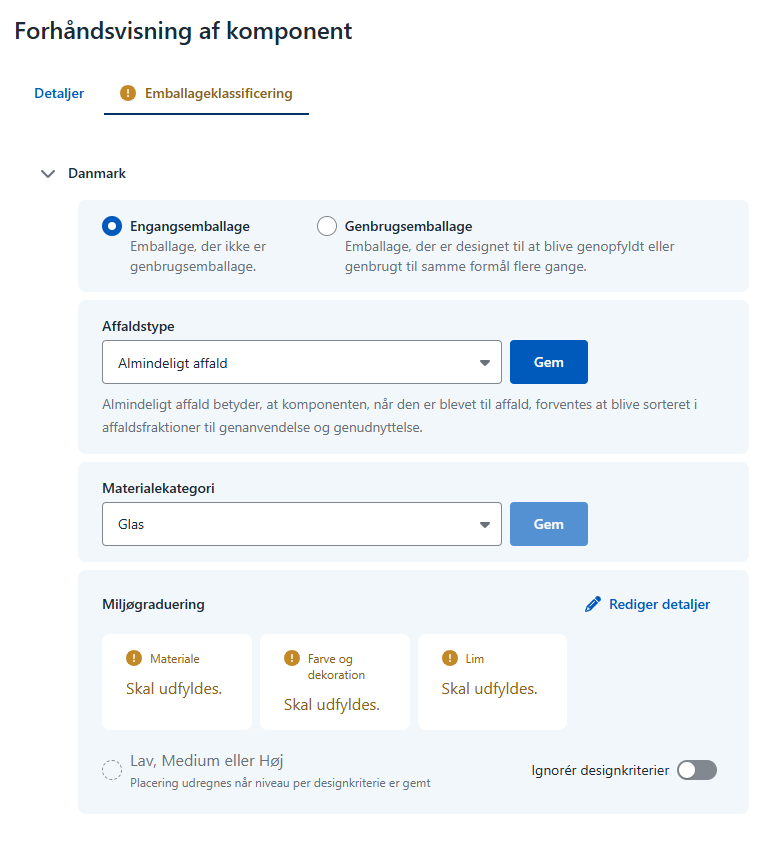 Klik på fanen Emballageklassificering. Såfremt komponenten endnu ikke er blevet miljøgradueret, vil teksten fremstå i gult med et udråbstegn.